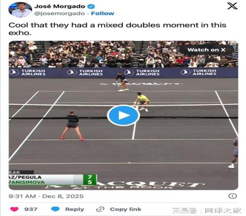 四位職業選手在上周日晚間聯手上演了一場混雙表演賽。卡洛斯與佩古拉搭檔,而蒂亞福則與阿尼西莫娃組隊。這是這位西班牙人第二次參加混雙比賽,上一次是他和拉杜卡努在美網混雙中輸給佩古拉與德雷珀。這一次,阿爾卡拉斯全情投入,與新的搭檔配合得十分開心。